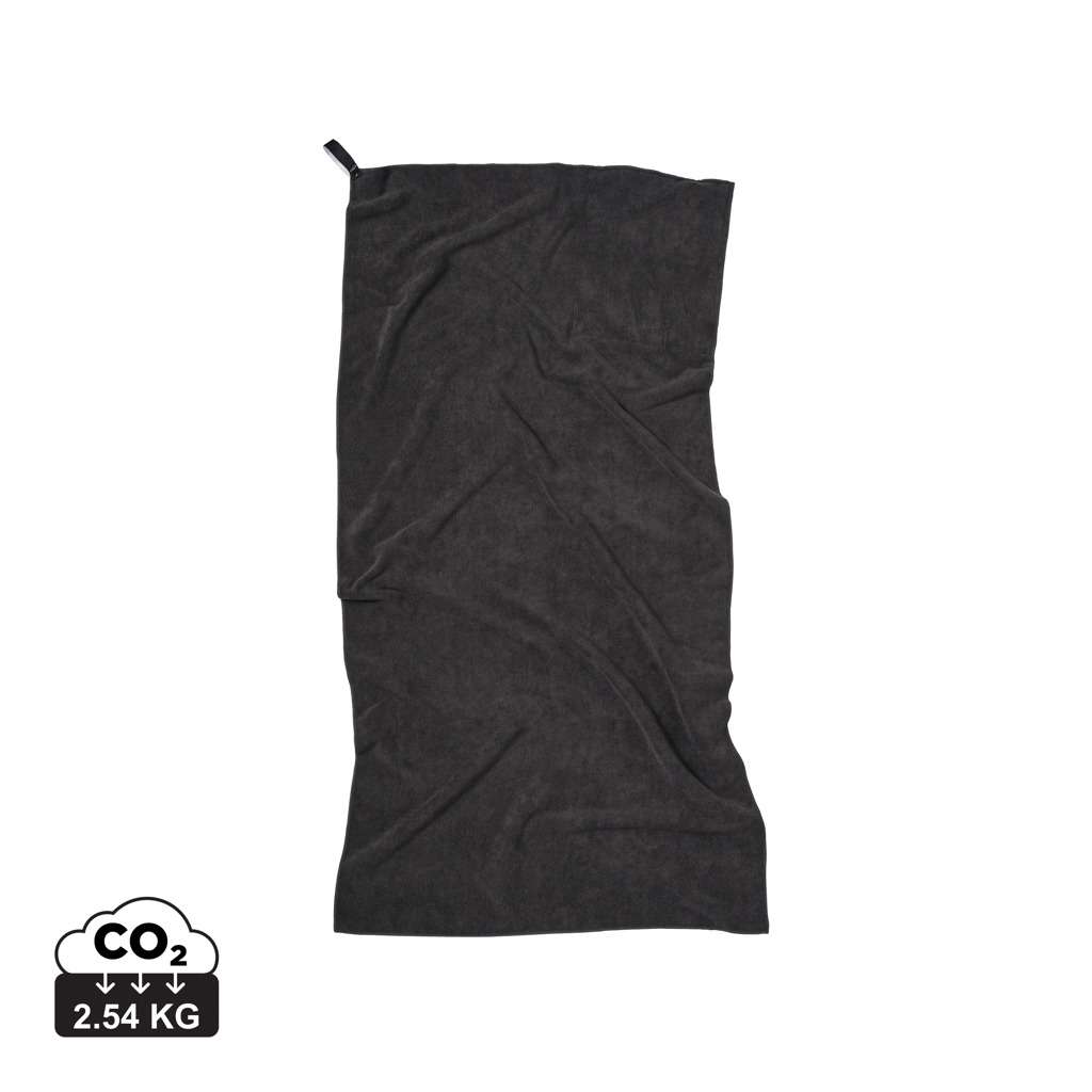 Asciugamano sportivo in microfibra realizzato con bottiglie in PET riciclate. Grazie all'esclusiva sensazione data dalla spugna, questo asciugamano assorbe più acqua e si asciuga tre volte più velocemente di un asciugamano tradizionale. Ottimo per le attività sportive e all'aperto. Leggero e compatto, l'asciugamano è ideale per i viaggi o la palestra. Realizzato con il 52% di materiali riciclati certificati GRS (Global Recycle Standard), con la certificazione GRS che garantisce catene di approvvigionamento di materiali riciclati completamente certificate. Contenuto riciclato totale basato sul peso totale del prodotto.