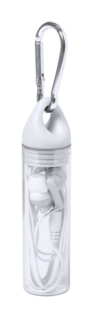 Auricolari con jack audio da 3,5 mm, in custodia di plastica con moschettone e cappuccio coordinato.