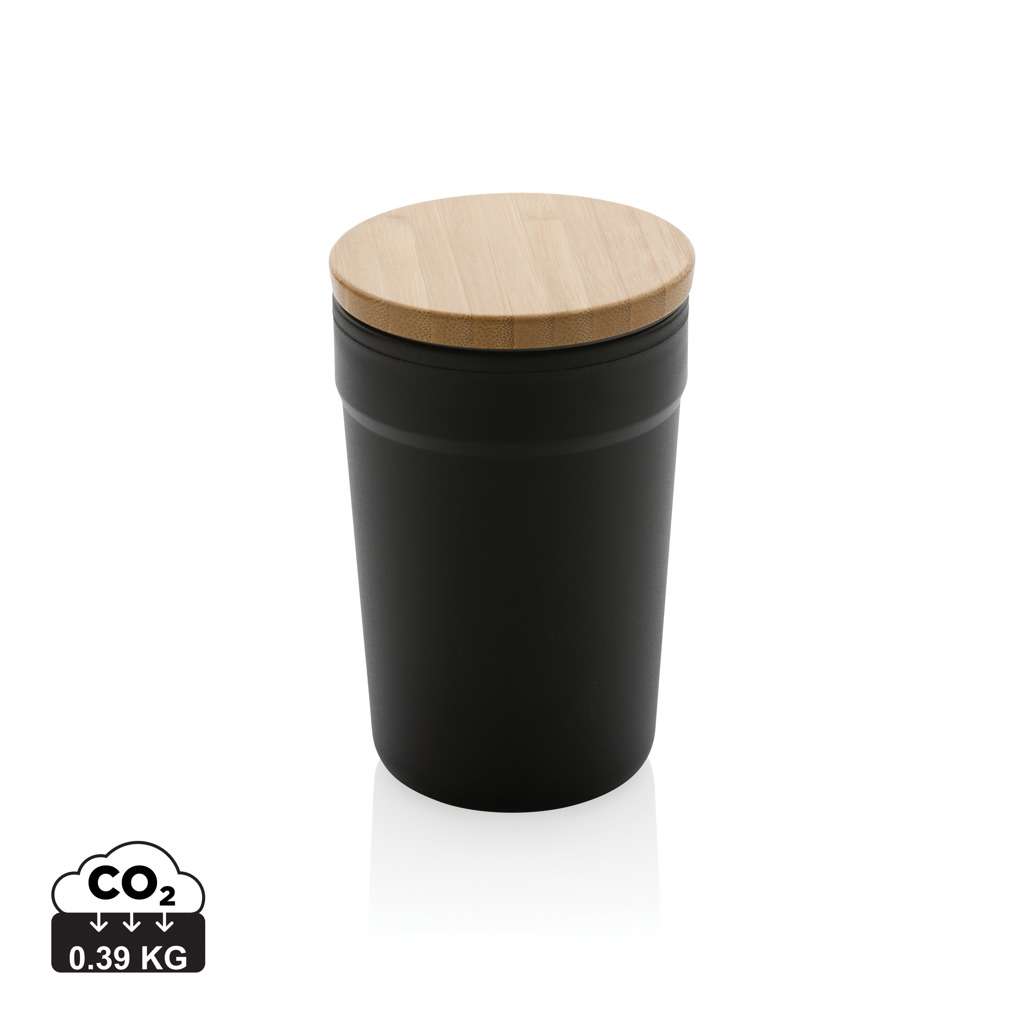 Questa bellissima tazza con coperchio in bambù è realizzata con PP riciclato certificato GRS. La certificazione GRS garantisce una catena di approvvigionamento completamente certificata dei materiali riciclati. E' dotata di un coperchio in bambù per l'utilizzo in viaggio. Contenuto totale di materiale riciclato: 52% in base al peso totale dell'articolo. Senza BPA. Capacità 300 ml. È inclusa una scatola kraft certificata FSC®.