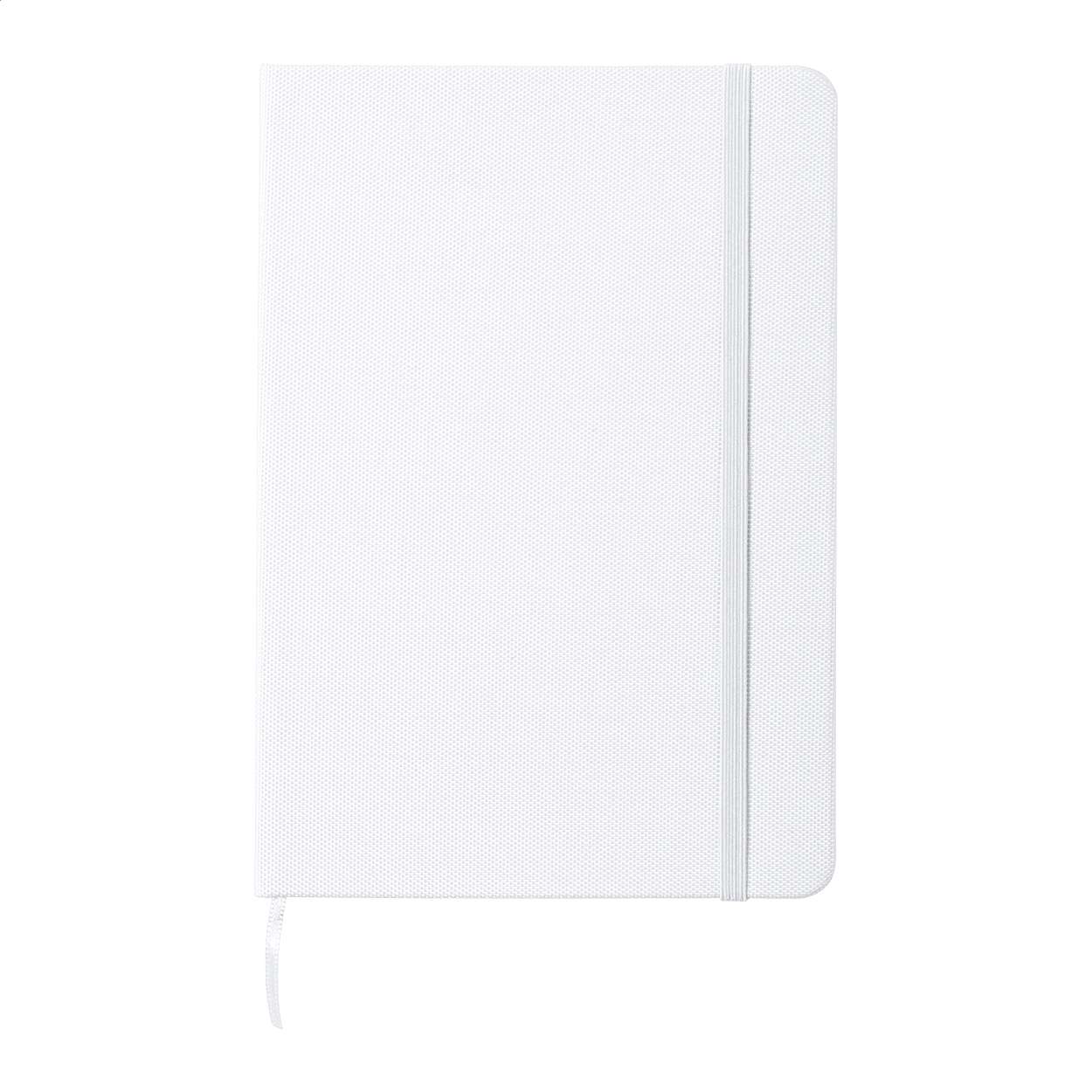 Quaderno rivestito in poliestere RPET con 80 fogli a righe, segnalibro e cinturino in gomma. Dimensione A5.
