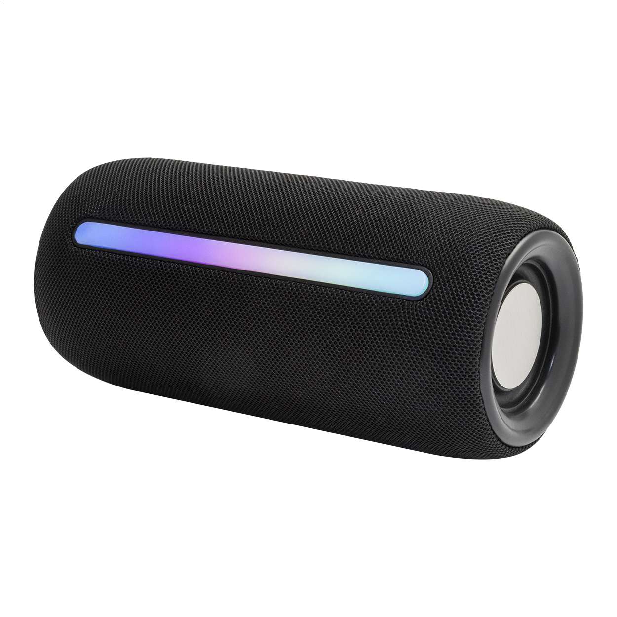 Cassa bluetooth rivestita in tessuto di poliestere con 2 altoparlanti, funzione di chiamata in vivavoce, batteria ricaricabile integrata (1200 mAh), luce LED multicolore e tracolla. Cavo di ricarica USB incluso.