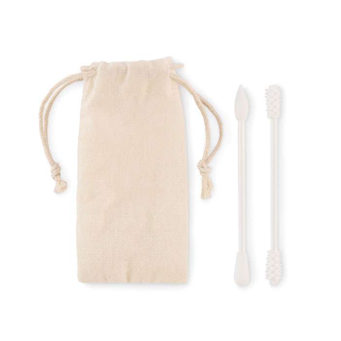 Set di 2 bastoncino cotonato in silicone riutilizzabili e lavabili con 3 teste diverse. Presentati in un astuccio di cotone con cordoncino.