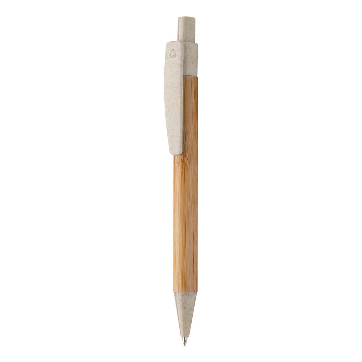 Penna a sfera di bambù con clip e puntale in plastica ecologica ricavata da paglia di grano. Con refill blu.