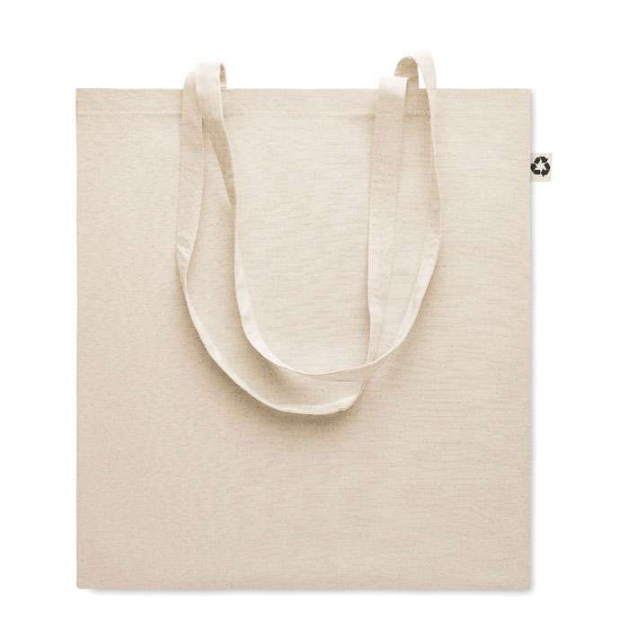 Borsa in cotone 140 gr/m² (65% cotone riciclato, 35% cotone normale) con manici lunghi.