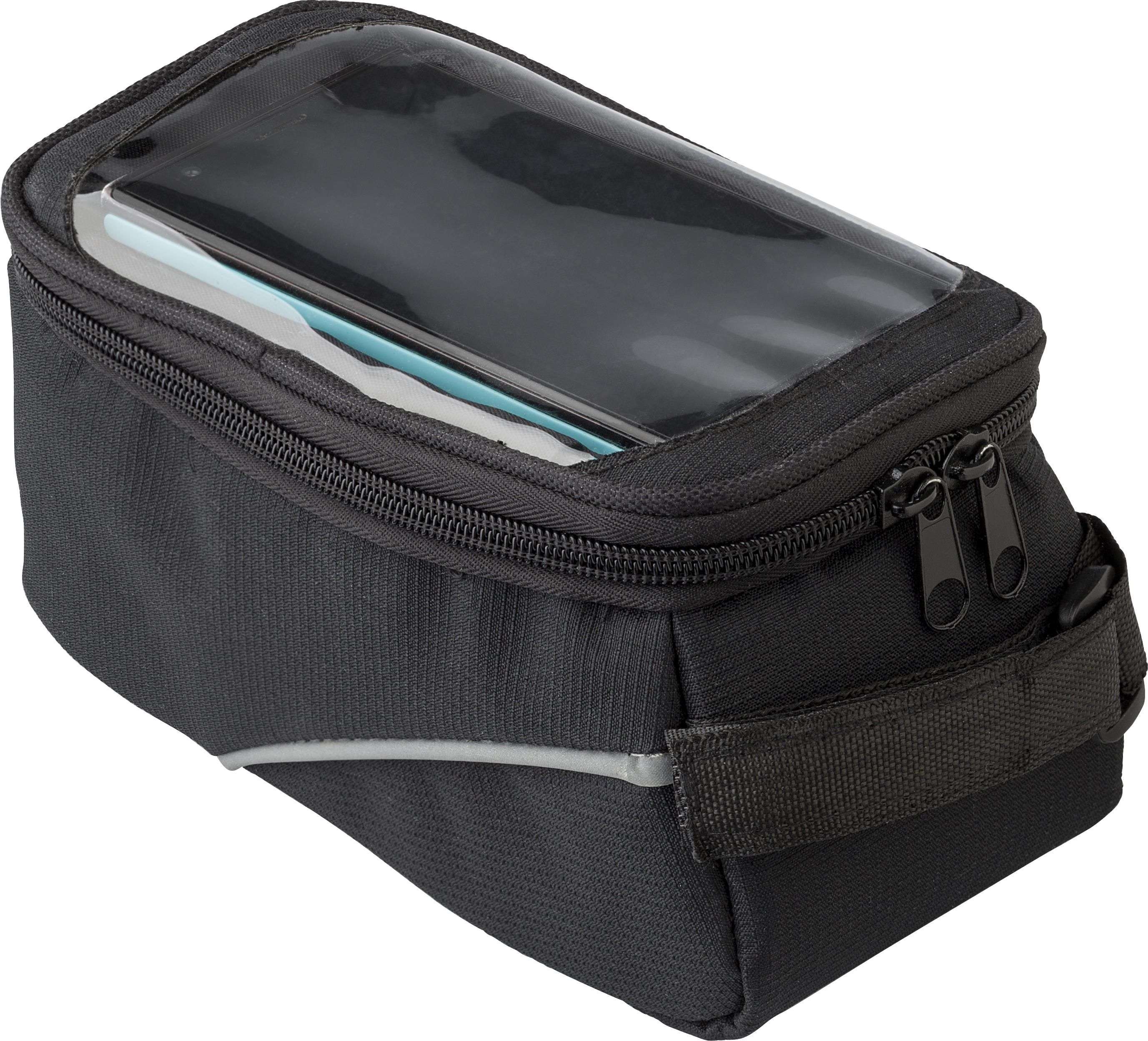 Borsa per bicicletta, scomparto superiore porta cellulare con display touch screen trasparente in PVC, passante laterale per gli auricolari, strisce riflettenti su entrambi i lati, cinghie per il fissaggio al manubrio in velcro, in poliestere 600 D e PVC