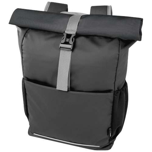 Borsa per bicicletta rolltop impermeabile porta pc realizzata interamente con materiali riciclati certificati GRS, inclusi tessuto esterno, fodera, cinghia e cerniere. Dotata di uno scomparto imbottito per laptop da 15 pollici, offre diverse tasche interne per una pratica organizzazione. La chiusura a strappo regolabile consente un facile fissaggio a vari modelli di bicicletta. I bordini catarifrangenti migliorano la visibilità. Capacità 20 litri. Priva di PVC.