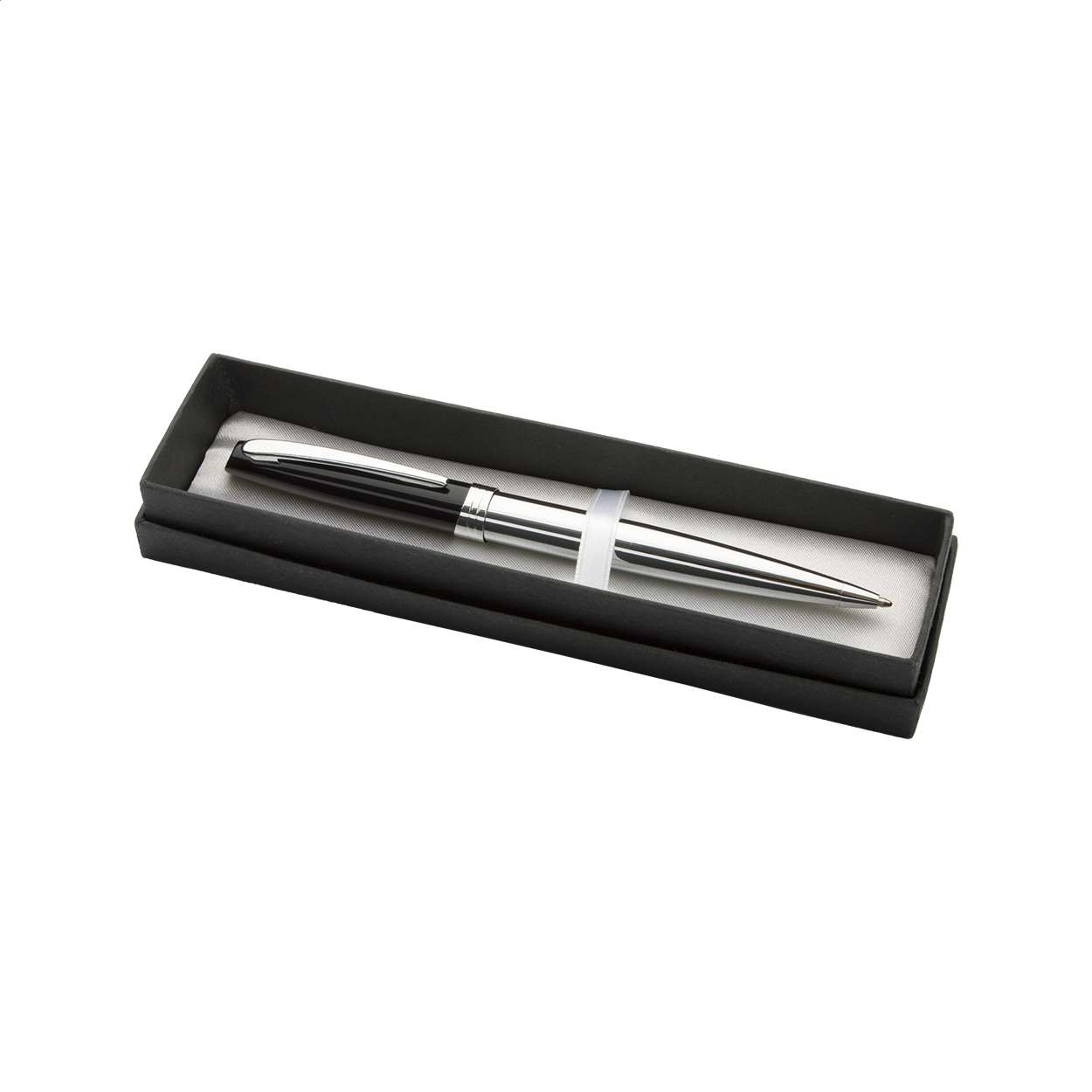 Penna a sfera in metallo con cappuccio nero laccato, corpo cromato lucido e clip. In confezione regalo e refill blu.