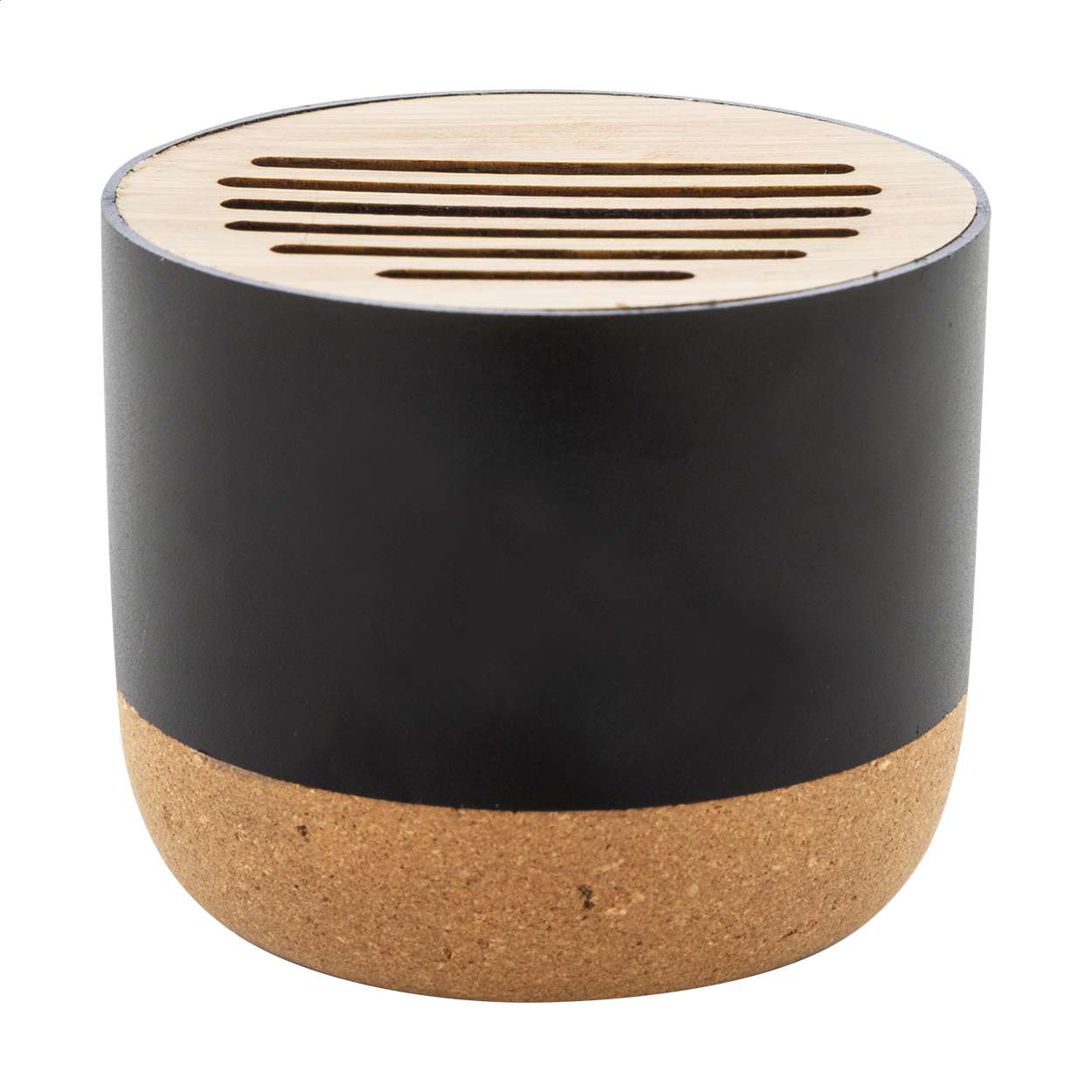 Cassa wireless in alluminio riciclato con copertura in bambù, base in sughero naturale e batteria ricaricabile (400 mAh). Cavo di ricarica USB incluso.