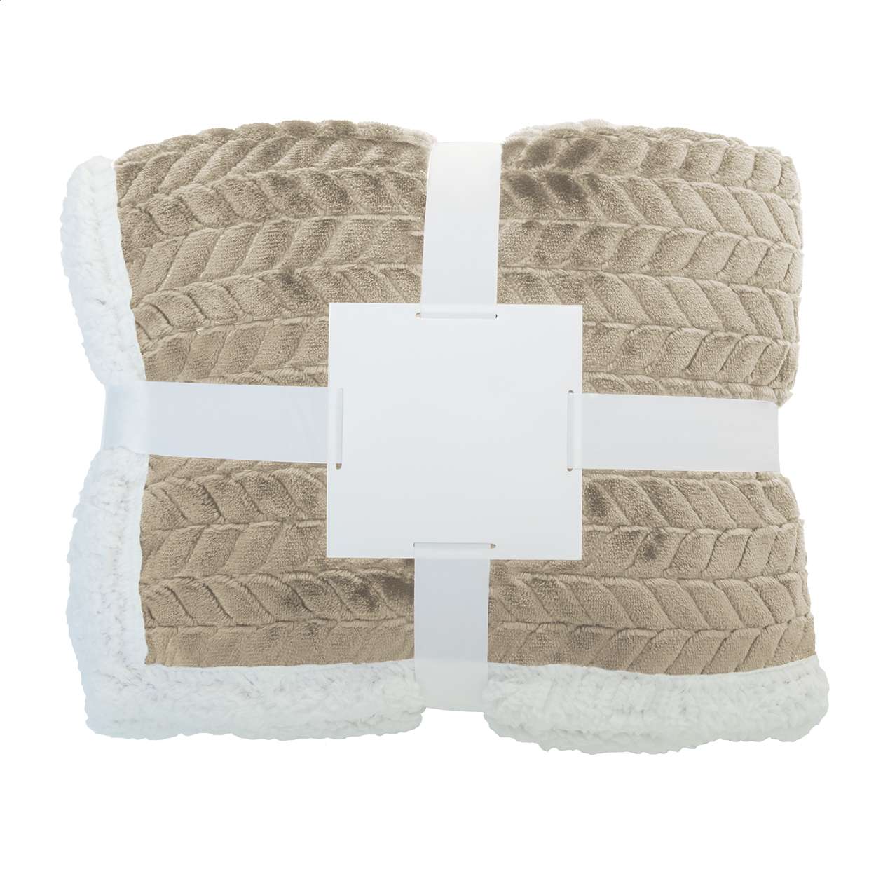 Coperta in RPET a doppio strato con motivo jacquard. Con pile di flanella RPET da 240 g/m² e fodera reversibile in pile sherpa RPET da 210 g/m². Confezionata con nastro e cartoncino stampabile.