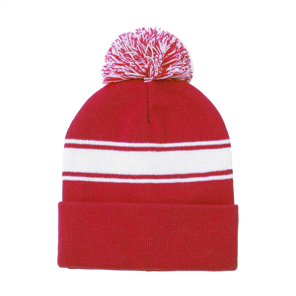 Cappello invernale in acrilico con strisce bianche e pompon coordinato.