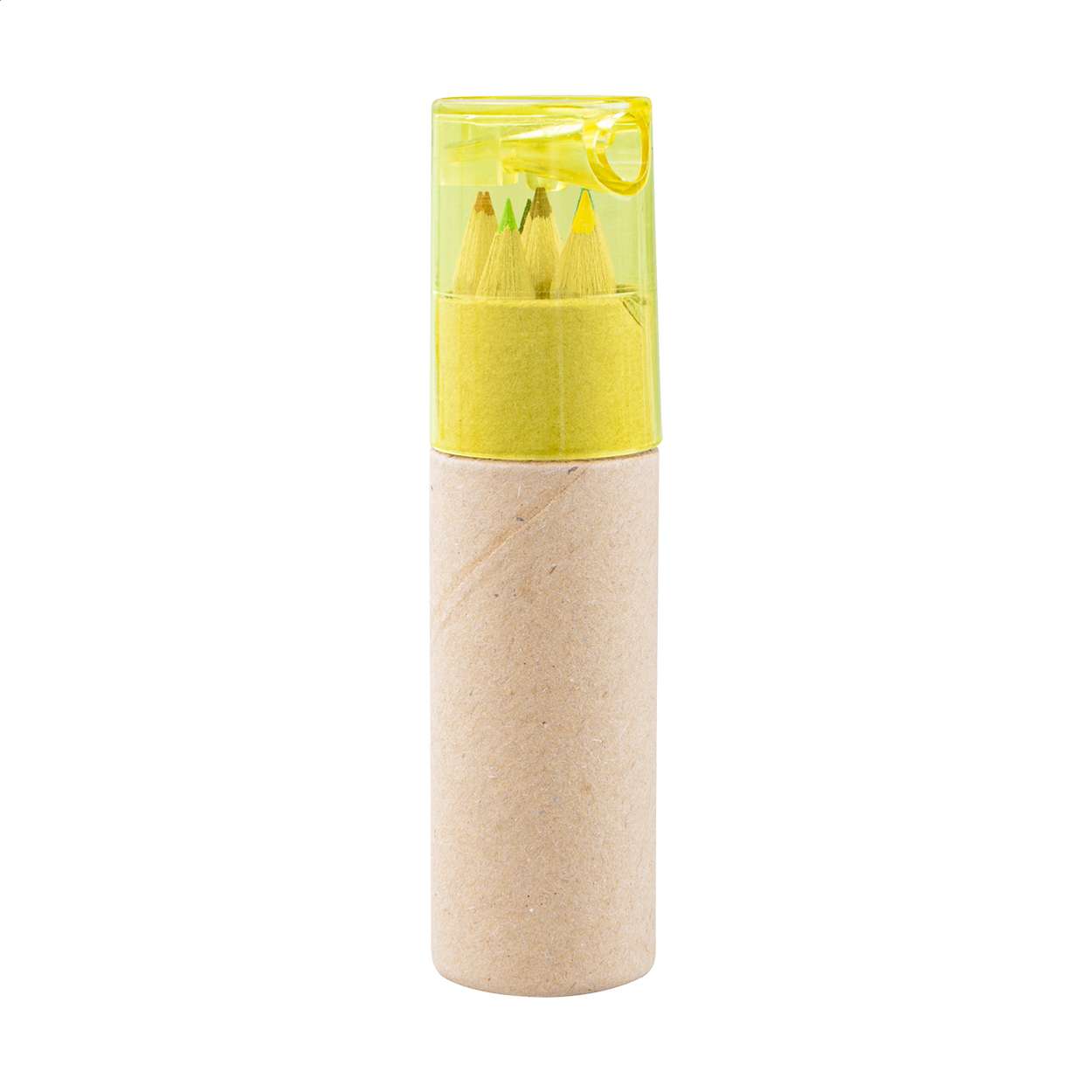 Set 6 matite colorate in confezione cilindrica di cartoncino con temperino in plastica.