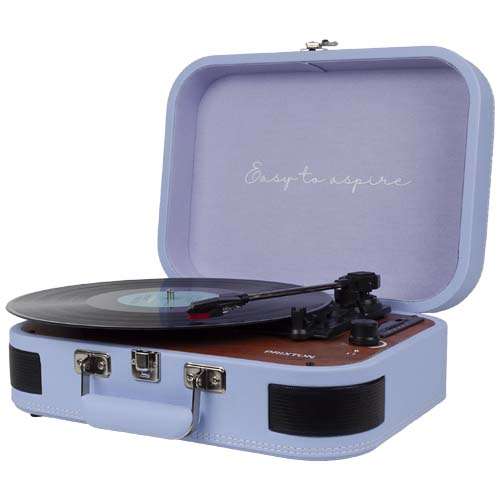 Giradischi per vinili e lettore musicale con Bluetooth® 5.0, USB, TF e radio FM. Può digitalizzare il vinile in formato WAV tramite l'ingresso USB e l'entrata TF. Dispone di uscita audio RCA e viene fornito con un paio di cuffie. Inclusa una testina rubino per riprodurre i dischi delicatamente. Con design a forma di valigetta. Il giradischi può essere collegato a un dispositivo mobile tramite Bluetooth® per utilizzare la funzione di speaker.