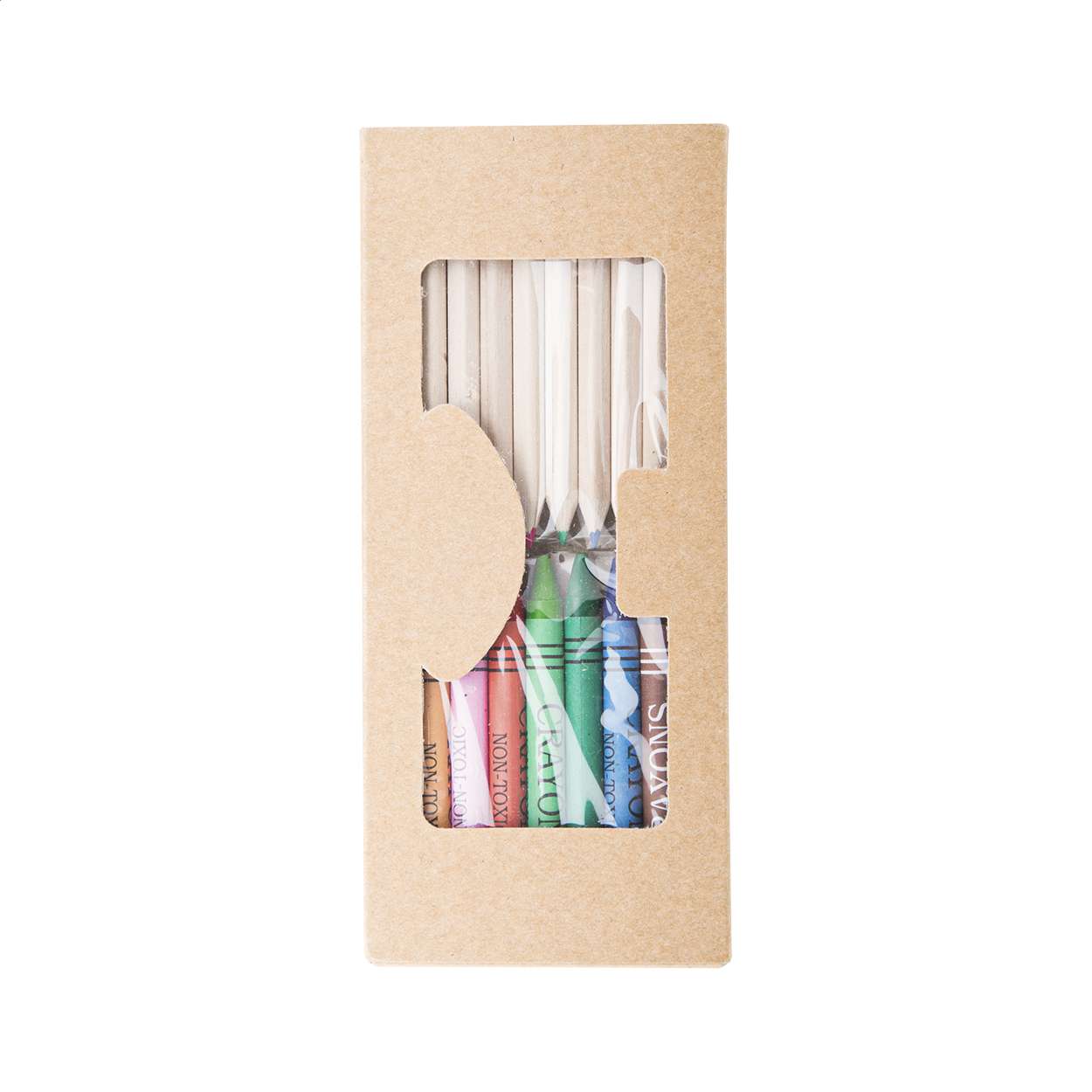 Set composto da matite colorate (10 pezzi) e pastelli (9 pezzi) in scatola di cartoncino riciclato con finestra.
