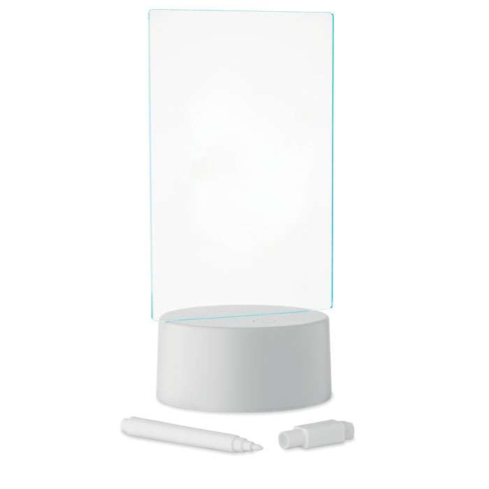Lavagna luminosa a LED con luce che cambia colore e pennarello bianco cancellabile. Presenta una lavagna in acrilico e una base in PS. Richiede 3 batterie AAA (non incluse).