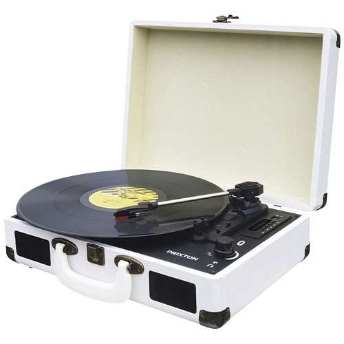 Lettore dischi in vinile e musica tramite bluetooth VC400 Prixton. Dispone di connettività Bluetooth, USB, TF e radio FM. Permette di digitalizzare i vinili in formato WAV tramite porta USB o slot TF. Dotato di uscite RCA e jack per cuffie, include una puntina a stilo rubino per una riproduzione delicata. Il design compatto a forma di valigetta lo rende facilmente trasportabile. Supporta velocità di 33,3, 45 e 78 giri al minuto.