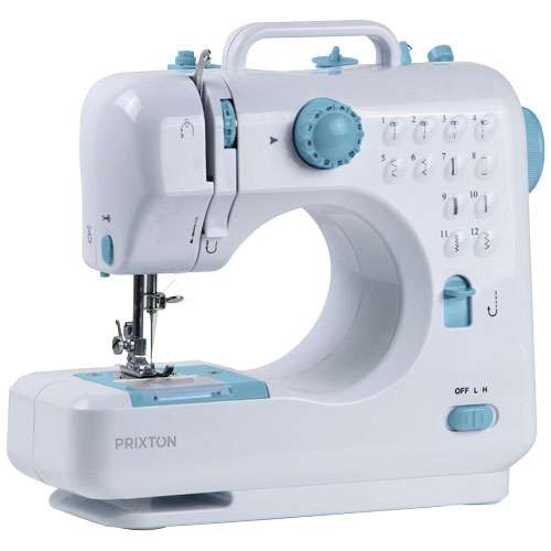 Macchina da cucire con 12 schemi di cucito incorporati. Cassetto integrato per riporre i fili, gli aghi e altri materiali. Luce per migliorare la visibilità mentre si cuce. Include il pedale e l'adattatore. Operazioni di cucito in avanti e indietro. La macchina si accende tramite l'interruttore manuale o il pedale. Può essere utilizzata collegandola a una presa di corrente oppure con le batterie (4 x AA). Regolatore di tensione. Manopola per la selezione. Tagliafilo. Volante avvolgimento spoletta.