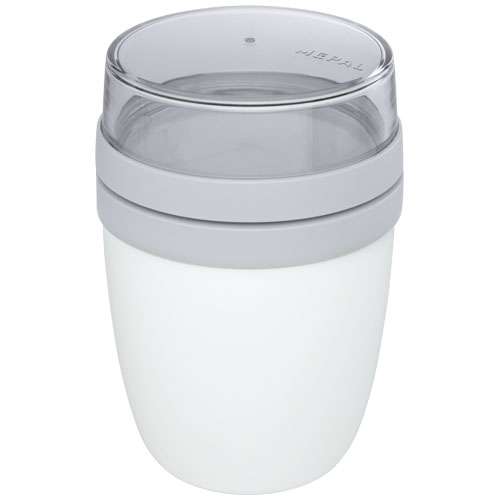 Vaso portapranzo con due diversi scomparti per mantenere separati gli ingredienti. Entrambi i contenitori hanno un coperchio separato e quindi rimangono puliti. Il contenitore trasparente superiore ha una capacità di 200 ml; può contenere quindi 75 grammi circa di cibo solido. Capacità del contenitore inferiore: 500 ml. Realizzato in materiale resistente e utilizzabile nel congelatore, nel microonde (rimuovere il coperchio) e nella lavastoviglie. Non utilizzare mai il contenitore trasparente superiore nel microonde. Ermetico. Senza BPA. 2 anni di garanzia Mepal.