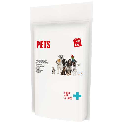 Il kit ideale per i vostri animali domestici. Questo kit è utile per curare piccoli incidenti durante le passeggiate, e consente di trattare le punture di insetti ai vostri animali. Contenuto: 12 cerotti resistenti all'acqua, 4 salviettine disinfettanti, 2 garze sterili, 1 pinzetta per zecche, 1 benda elastica, 1 pinzetta, 1 nastro adesivo per benda. Tutti i prodotti contenuti nei MyKit rispettano le norme Europee vigenti. I prezzi includono stampa all-over fronte e retro. Fornito in una custodia di carta.