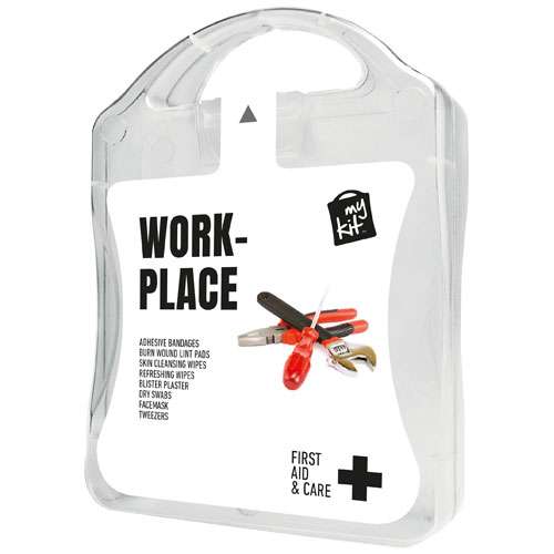 Il kit ideale sul lavoro. Questo kit dovrebbe essere present ein ogni posto di lavoro, per essere preparati per i piccoli incidenti o emergenze. Contenuto: 12 cerotti resistenti all'acqua, 4 salviettine disinfettanti, 2 garze sterili, 1 mascherina, 2 cerotti per vesciche, 2 garze per ustioni, 2 salviettine rinfrescanti, 1 pinzetta. Tutti i prodotti contenuti nei MyKit rispettano le norme Europee vigenti. I prezzi includono stampa all-over fronte e retro.