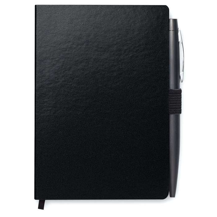 Notebook A6 con penna. Copertura rigida in PU. 144 pagine a righe (72 fogli). Cinturino di chiusura elastico e portapenne abbinati. Penna a sfera a bottone in metallo abbinata. Inchiostro blu.