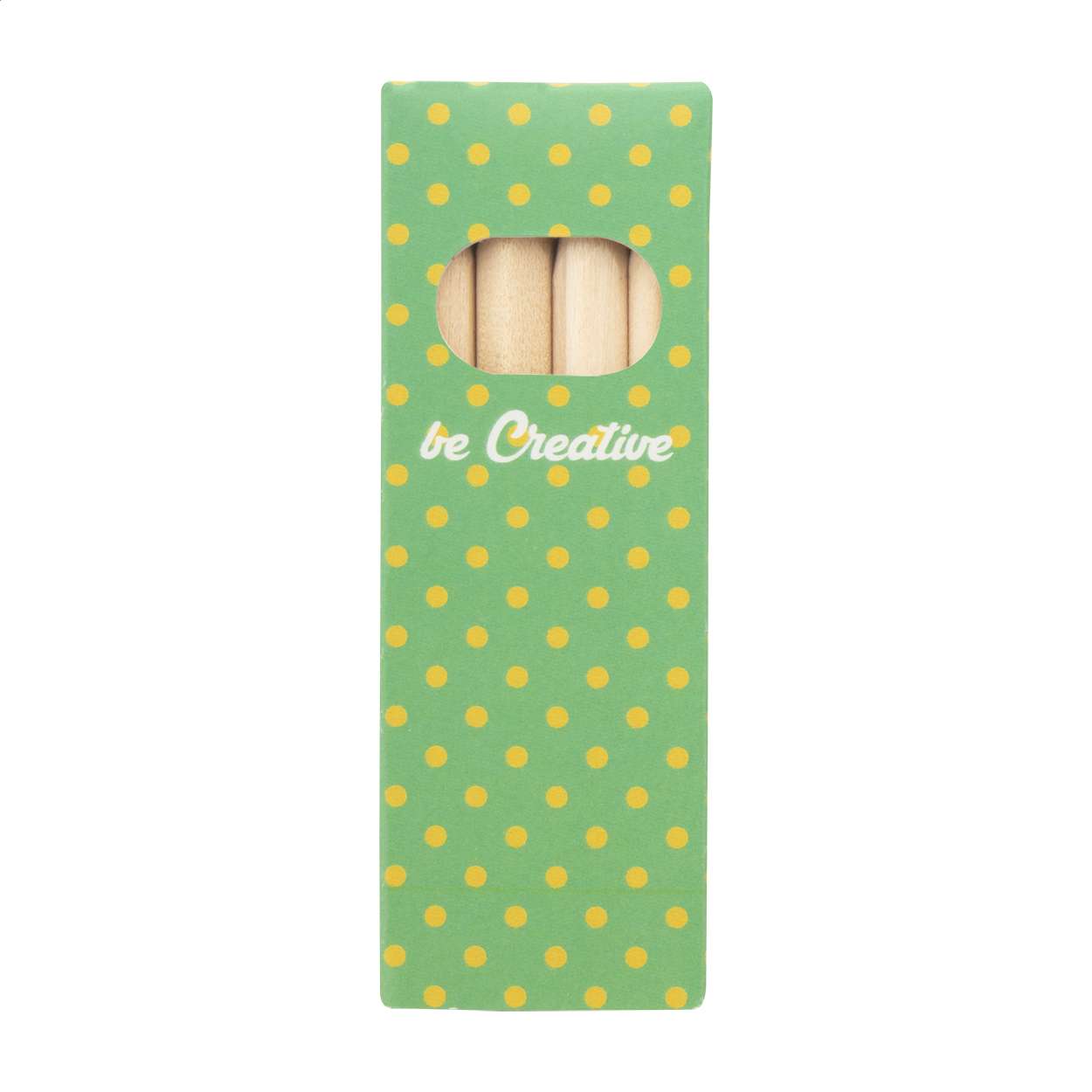 Matite colorate in legno (4 pezzi) in scatola di cartoncino kraft stampato a colori. Il prezzo include la stampa digitale. MOQ: 100 pezzi.