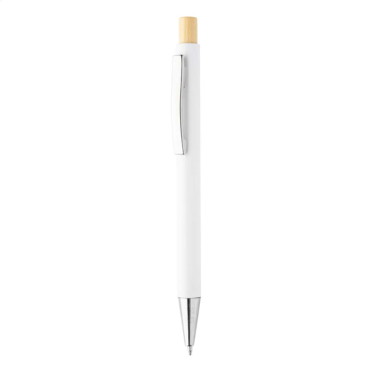 Penna a sfera in plastica ABS riciclata con pulsante in bambù, clip in metallo e refill blu.