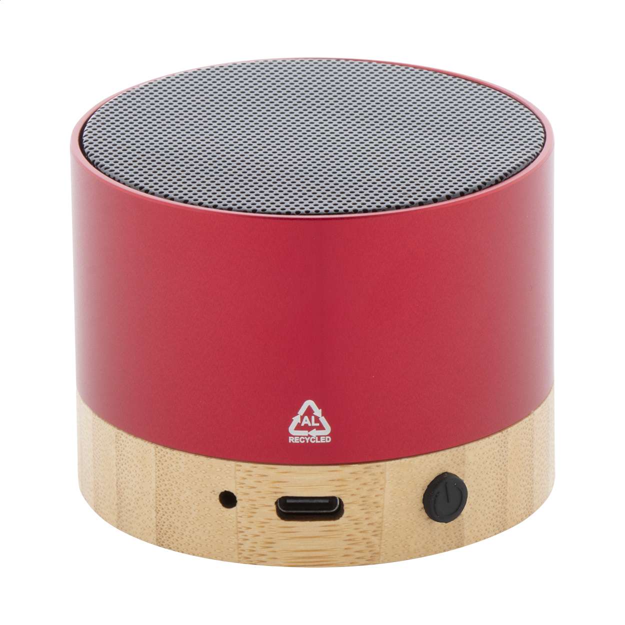 Cassa bluetooth in alluminio riciclato con base in bambù, con funzione di chiamata in vivavoce e batteria ricaricabile integrata. Fornita con cavo di ricarica USB.