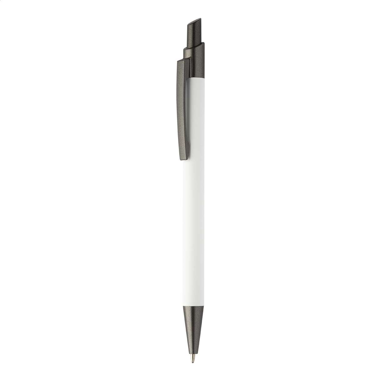 Penna a sfera in alluminio riciclato con fusto gommato e componenti in color canna di fucile. Fornita con refill blu.