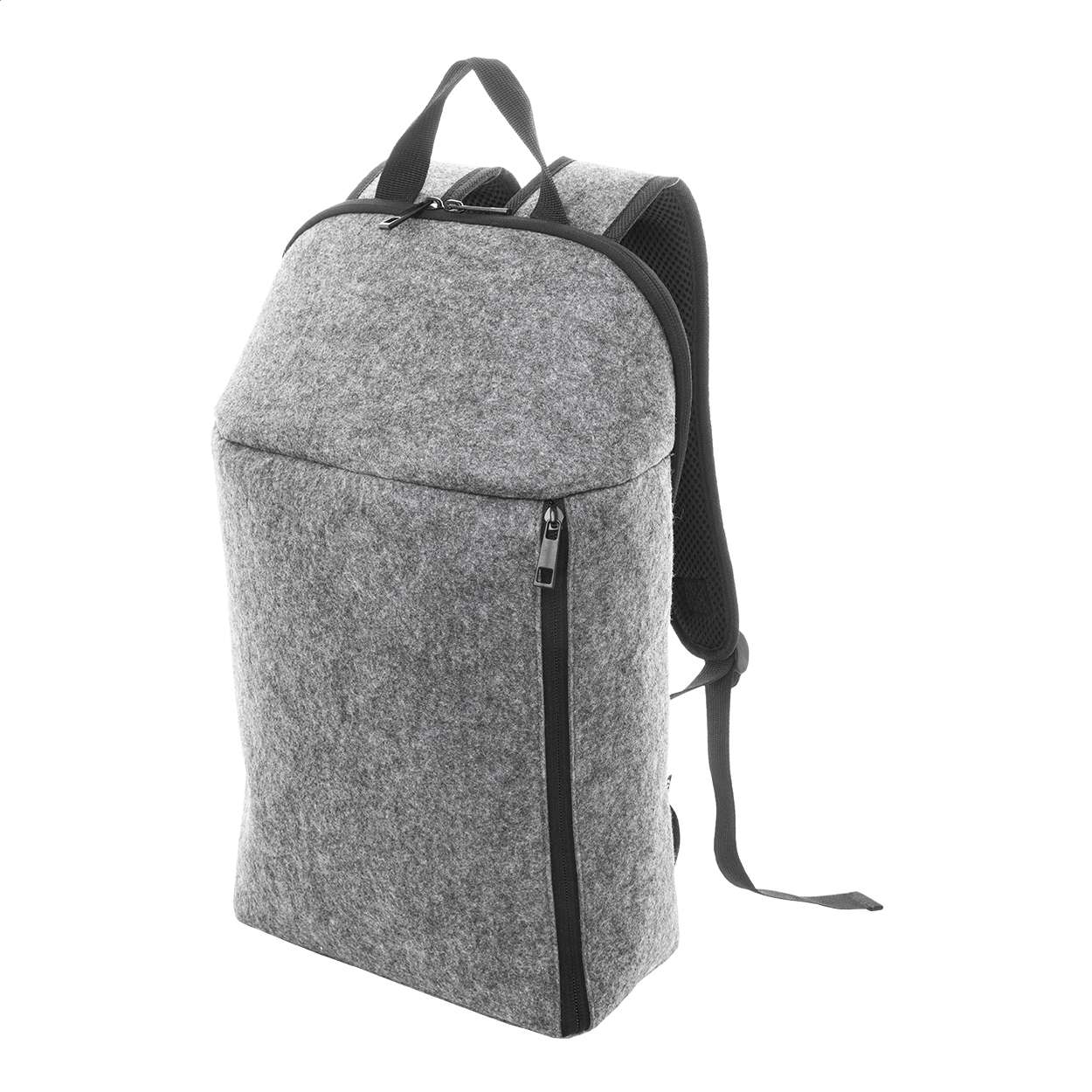 Zaino termico in feltro RPET con imbottitura in PEVA, spallacci imbottiti, scomparto principale con cerniera, tasca frontale ed etichetta RPET.