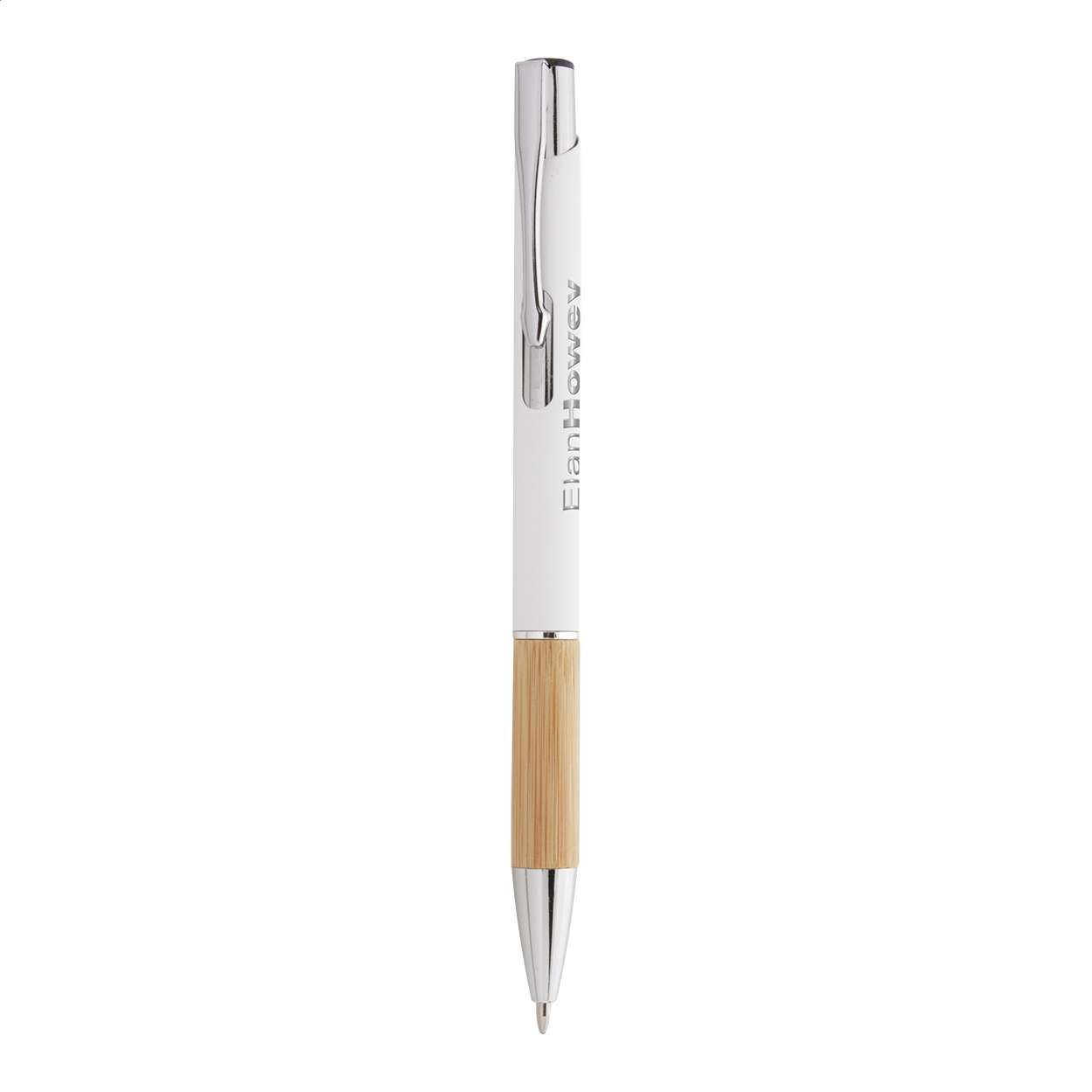 Penna a sfera in alluminio con impugnatura in bambù, finitura gommata, refill blu e speciale rivestimento per incisione laser a specchio.