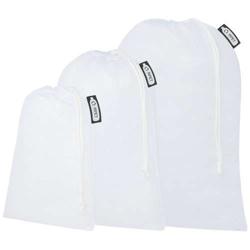 Set di tre sacchetti per frutta e verdura riutilizzabili realizzati al 100% in poliestere riciclato da 60-65 g/m² con chiusura a coulisse Disponibili nelle misure 15 x 21 cm, 25 x 32 cm, 30 x 41 cm. L'utilizzo di questi sacchetti fornisce un contributo eco-friendly alla riduzione delle borse di plastica. La resistenza di questi prodotti ne garantisce lavabilità e riutilizzabilità, assicurandone al contempo pulizia ed igiene. Stampabili su tutta la superficie in sublimazione. Realizzati in Europa.