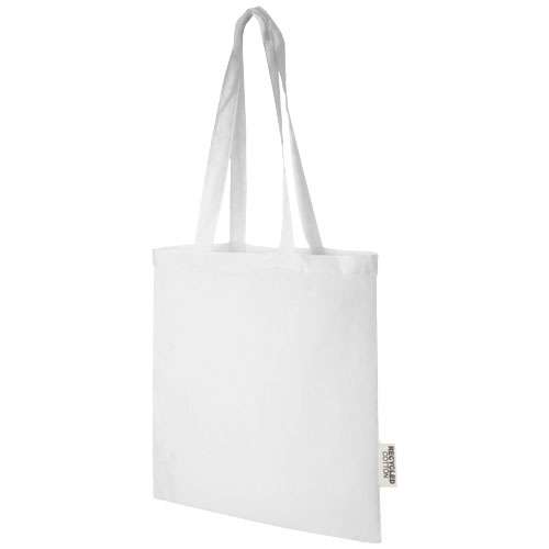 Shopper cotone riciclato certificato 100% GRS, la borsa perfetta da regalare durante un evento, una conferenza oppure da utilizzare come borsa per la spesa. La densità del cotone di 140 g/m² rende questa borsa robusta, resistente e adatta per trasportare oggetti pesanti nello scomparto principale. Grazie ai manici lunghi 30 cm, questa tote bag è facile da trasportare. Anche i metodi di stampa disponibili per questa tote bag sono certificati GRS, assicurando che l'intera catena di fornitura sia trasparente e certificata. Realizzata in India. Resistenza fino a 5kg di peso.