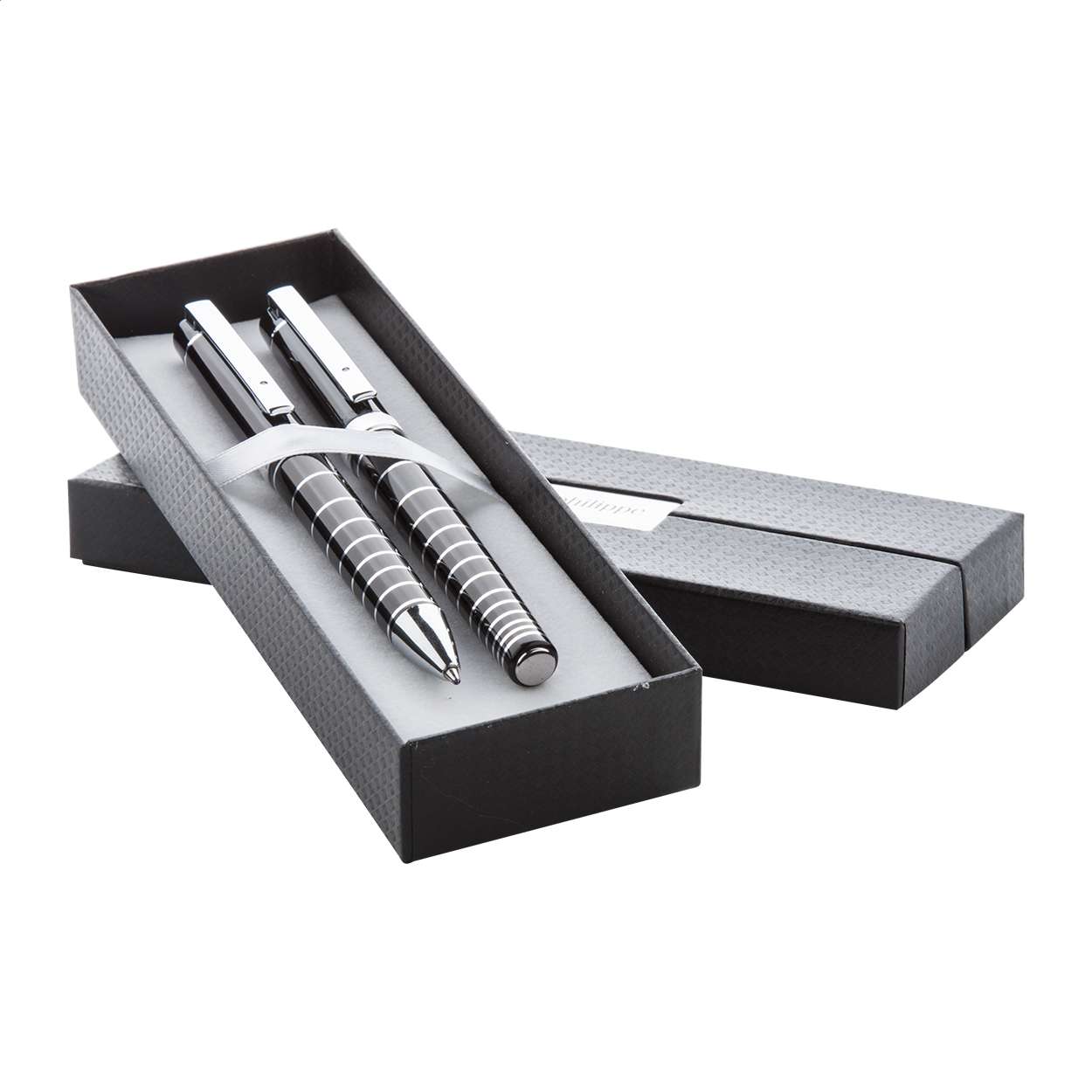 Set di penne in alluminio André Philippe, composto da una penna a sfera ed una penna roller con corpo lucido e decorazione ad anelli cromati. Fornito in confezione regalo e refill blu.