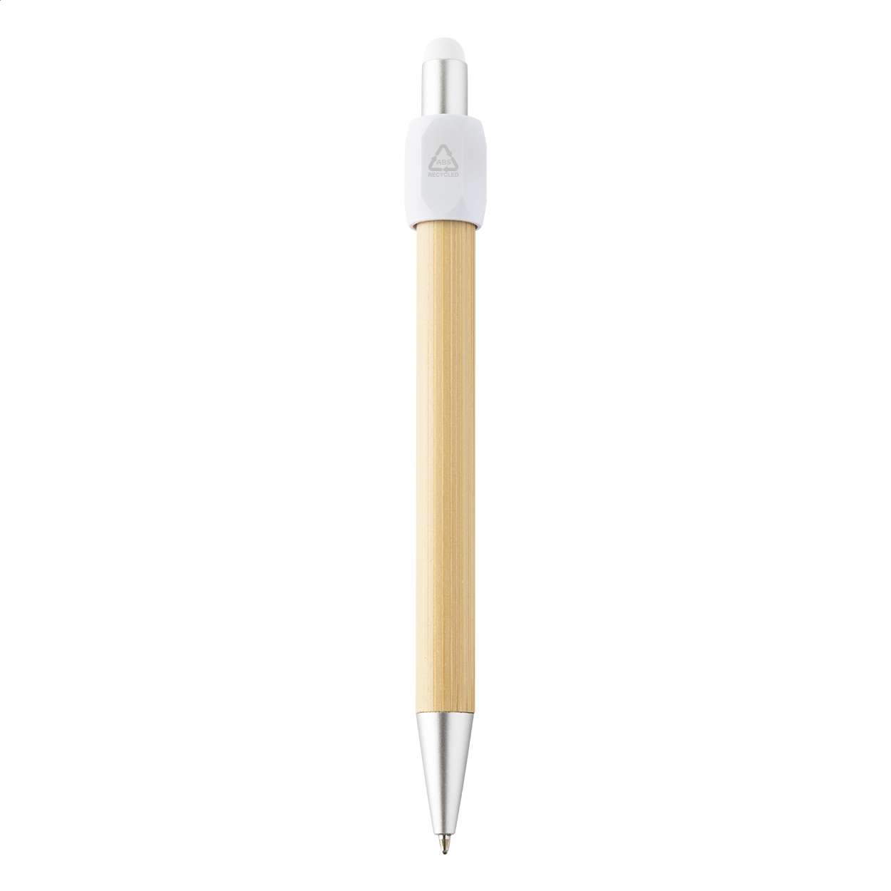 Penna a sfera capacitiva in bambù con fidget spinner in plastica ABS riciclata e refill blu.