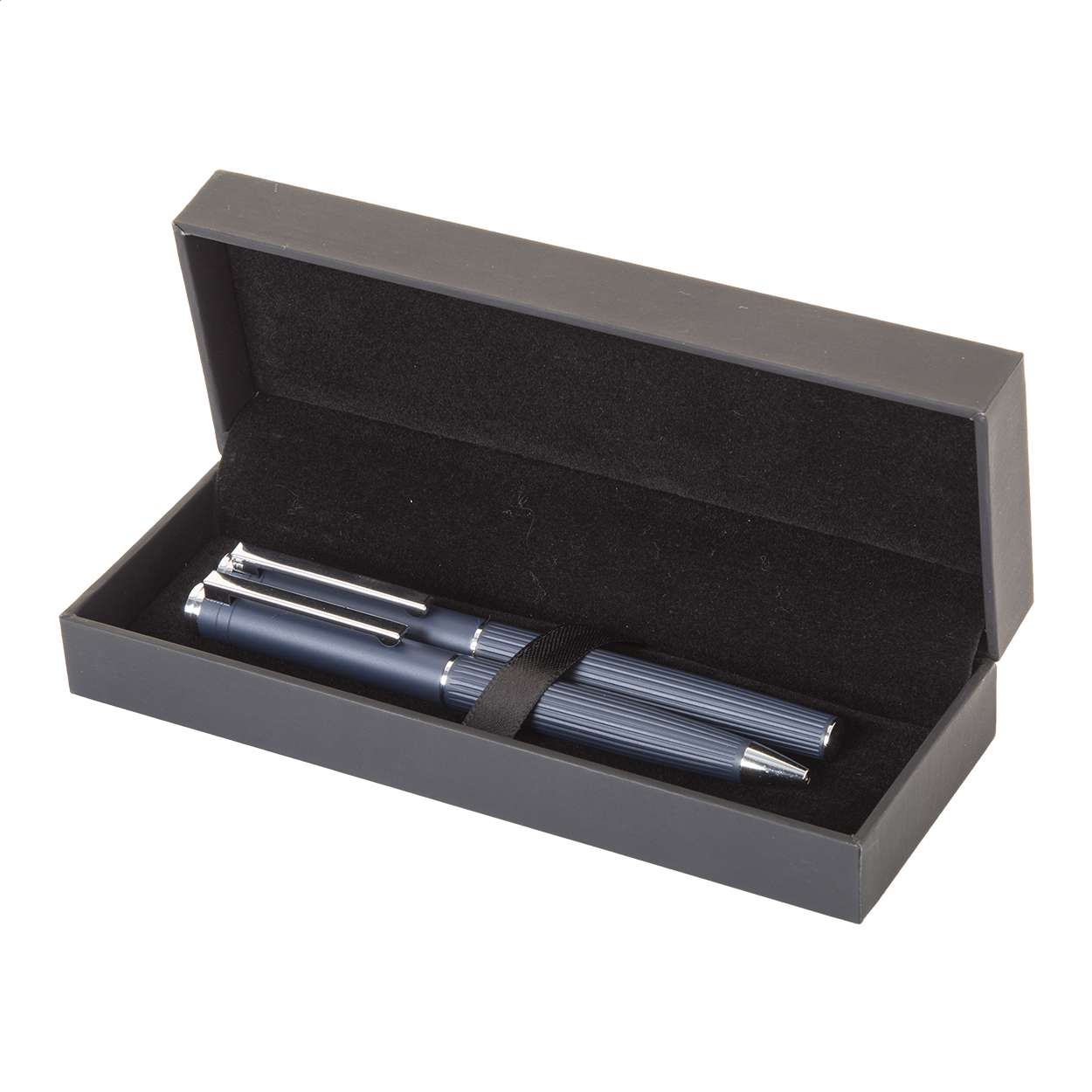 Elegante set composto da una penna a sfera ed una roller con fusto in alluminio testurizzato a righe, in confezione regalo nera e refill blu.