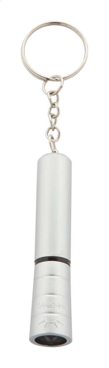 Mini torcia in plastica con 1 LED, finiture metalliche e portachiavi in metallo. Fornita di batteria a bottone.