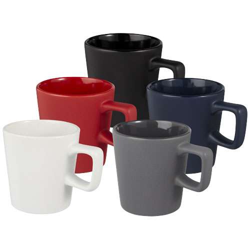 Tazza con logo personalizzato in ceramica Ross da 280 ml, combina un design moderno con una finitura opaca elegante, rendendola perfetta per personalizzazioni con logo o messaggi aziendali. Con una capacità di 280 ml, è ideale per gustare bevande calde in qualsiasi ambiente, dalla casa all'ufficio. Progettata per resistere all'uso quotidiano, è lavabile in lavastoviglie senza limitazioni, indipendentemente dal metodo di personalizzazione scelto. Fornita in una confezione regalo in cartone riciclato, rappresenta una soluzione pratica ed ecologica per promuovere il tuo brand con stile.