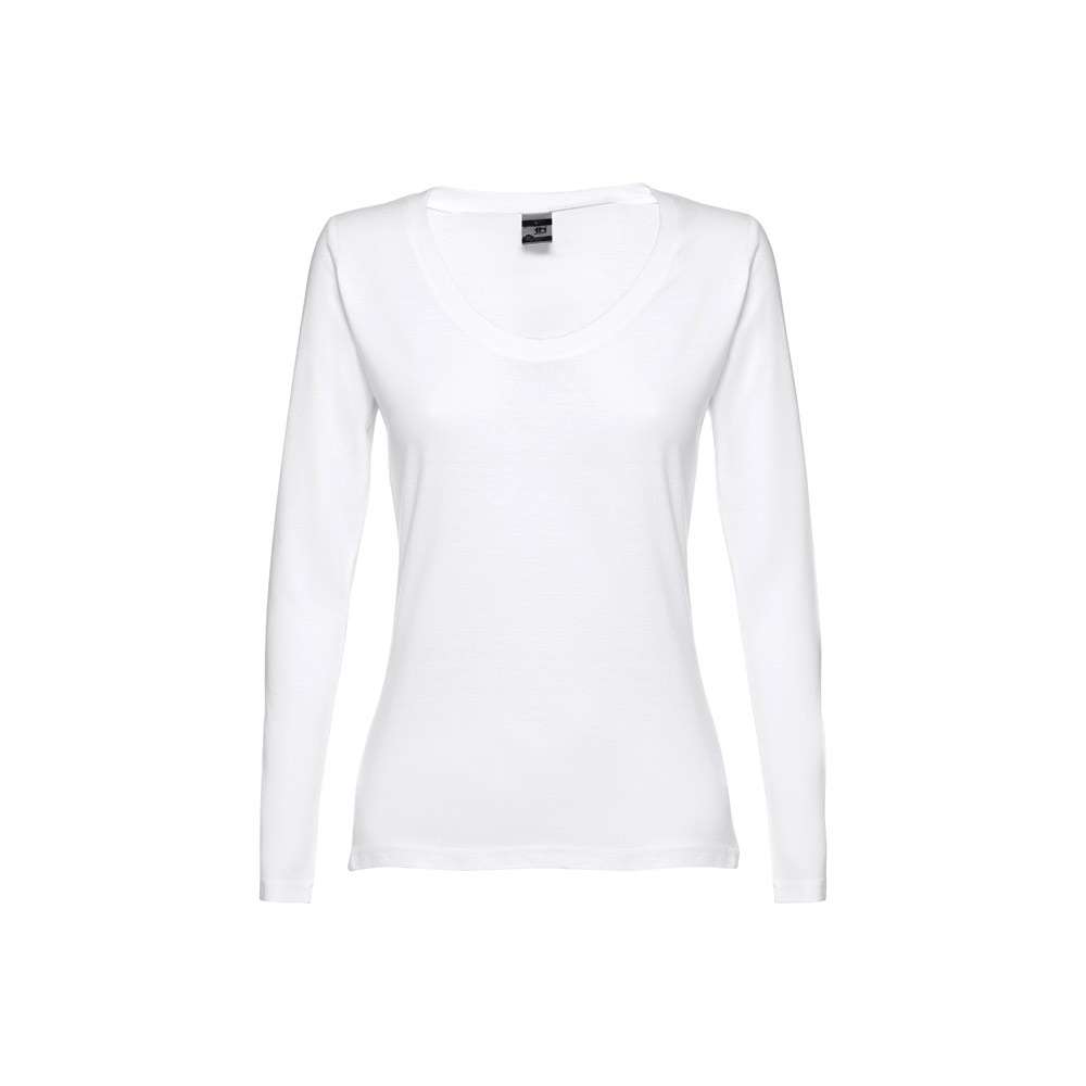 T-shirt a manica lunga da donna in jersey 100% cotone (150 g/m²) con filo di cotone cardato. Taglio moderno, colletto con nastro di rinforzo in jersey. T-shirt tubolare con taglio regolare e cucitura doppia su maniche e parte inferiore. Taglie: S, M, L, XL, XXL