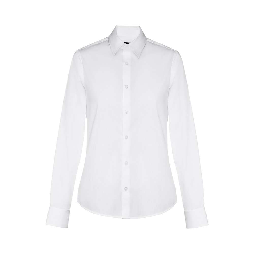 Camicia popeline a maniche lunghe da donna in 68% cotone, 28% poliammide e 4% elastan (115 g/m²). Maniche lunghe con una piega e polsini regolabili con 1 bottone. Vestibilità aderente con 2 pinces posteriori. Abbottonatura con 7 bottoni in tinta. Taglie: S, M, L, XL, XXL