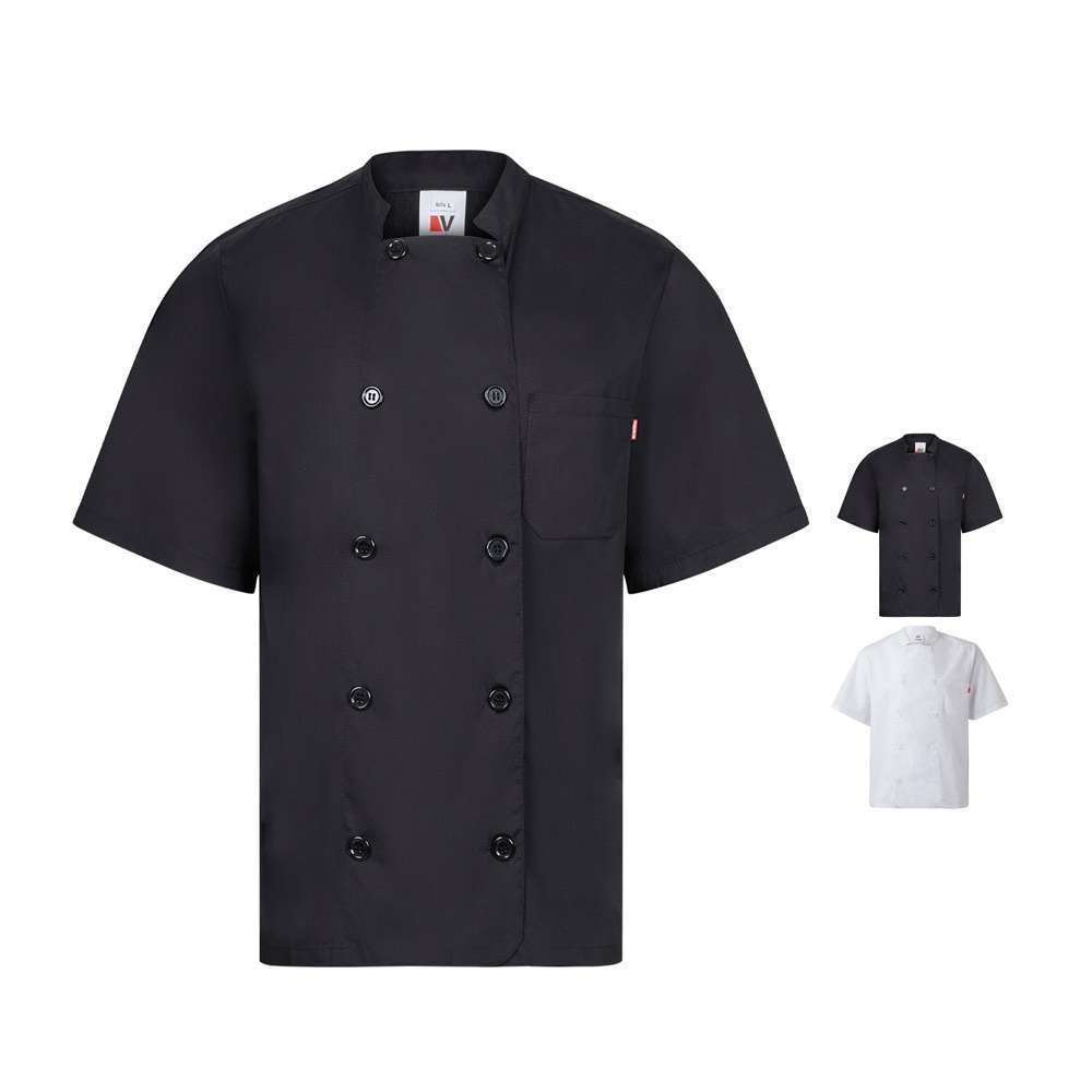 Giacca da cucina a maniche corte in popeline (110g/m²) in cotone (35%) e poliestere (65%). Con sistema di chiusura a doppio petto e 1 tasca sul torso. Taglia: XS, S, M, L, XL, 2XL, 3XL