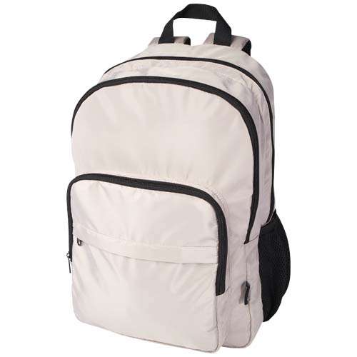 Zaino per portatile 15 pollici da 20 litri, realizzato in materiale riciclato certificato GRS con tessuto morbido e resistente alle pieghe, foderato in PET riciclato di qualità . Include uno scomparto imbottito per laptop, un vano con organizzatori interni, tasche frontali con zip e tasche laterali in rete elastica. Il retro in rete è dotato di cinghia per l’aggancio a un trolley. Spallacci regolabili garantiscono comfort. Capacità 20 litri, resistenza fino a 10 kg. Privo di PVC.